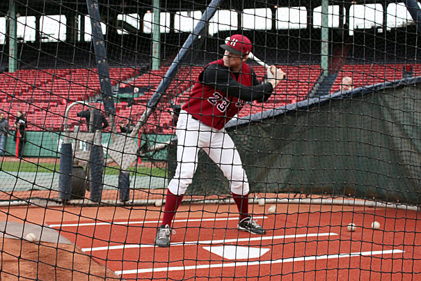 Harvard’s baseball team took batting practice at Fenway Park to commemorate the 100th anniversary of the first game played there, which Harvard lost to the forbears of the Red Sox, 2-0.