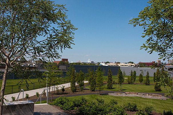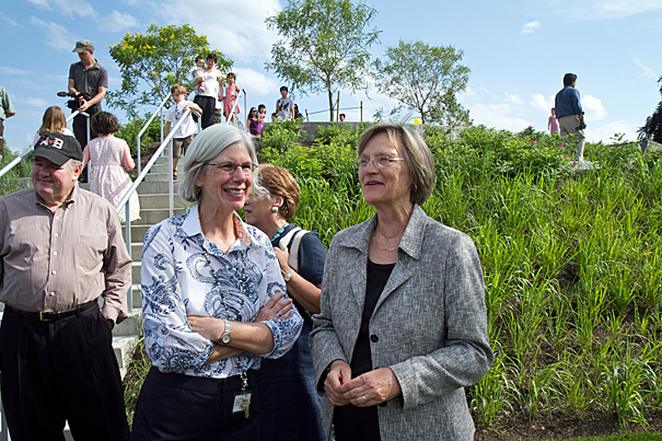 Harvard and Boston celebrated the opening of Library Park in Allston, a new community space on Harvard-donated land. Complete with fountains, footpaths, and 150 new trees, the 1.74-acre green space is located behind the Honan-Allston Branch of the Boston Public Library. A hallmark of sustainability, lifelong residents remembered its industrial past, while praising it transformation into functional beauty.