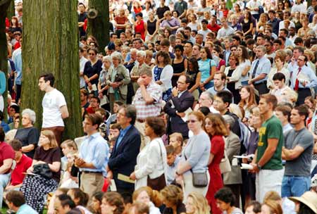 More than 10,000 members of the Harvard University community gathered in Tercentenary Theatre at noon on Sept. 11 to mark the one-year anniversary of the Sept. 11 attacks. With words, music, and prayer, students, religious leaders, and President Lawrence H. Summers honored the day’s tragic events and offered messages of peace and hope.