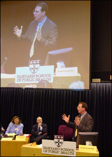 The panelists included SPH Dean Barry Bloom; Dora Mills, director of the Maine Bureau of Health; Robert J. Blendon, professor of health policy and management at SPH; Anita Barry, director of the Boston Public Health Commission’s Communicable Disease Control; Alfred DeMaria, state epidemiologist and assistant commissioner of the Massachusetts Department of Public Health; and Leonard Marcus, lecturer on public health practice at SPH. The moderator was Deborah Prothrow-Stith, professor of public health practice at SPH.