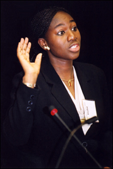 to an audience in Snyder Auditorium at the Harvard School of Public Health on March 9, one day after being named a recipient of a 2004 Reebok Human Rights Award. The award, provided by the Reebok Human Rights Foundation, will be presented at a ceremony on May 5 at Lincoln Center in New York City.