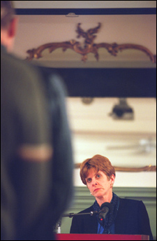 Louise Richardson, executive dean of the Radcliffe Institute for Advanced Study and an expert on international terrorism, opened Radcliffe’s 2004 Voices of Public Intellectuals series on “Confronting Terrorism: Democracy’s Response to the Terrorist Threat” Thursday (Feb. 26). In her lecture, “The Nature of the Terrorist Threat,” she put terrorism in context, providing historical, psychological, religious, and international lessons from which the United States might learn.