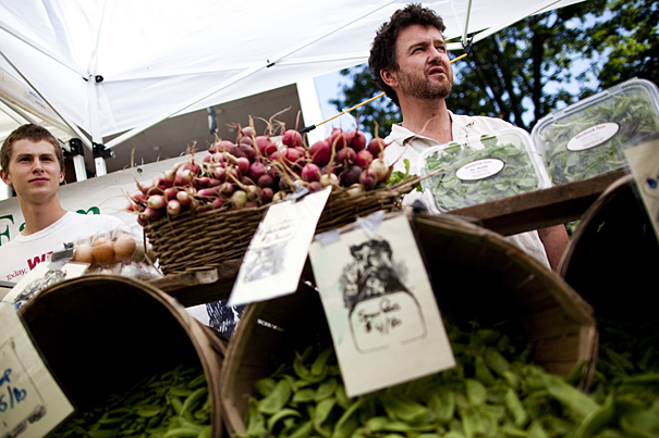 The Farmers’ Market at Harvard opened for its fifth year on the lawn between the Science Center and Memorial Hall. Calder Alexander (left) and Andrew Pollock, owner of Silverbrook Farms, had produce aplenty.