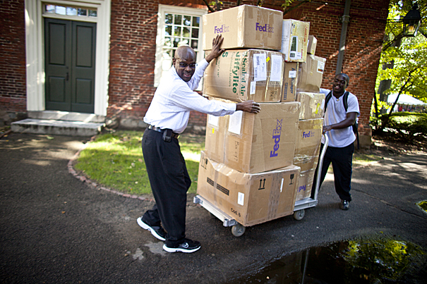 Freshman Terrance Moore (right) and his father Melvin move Terrance’s boxes past Massachusetts Hall and into Straus Hall where Terrance will join the Class of 2014.
