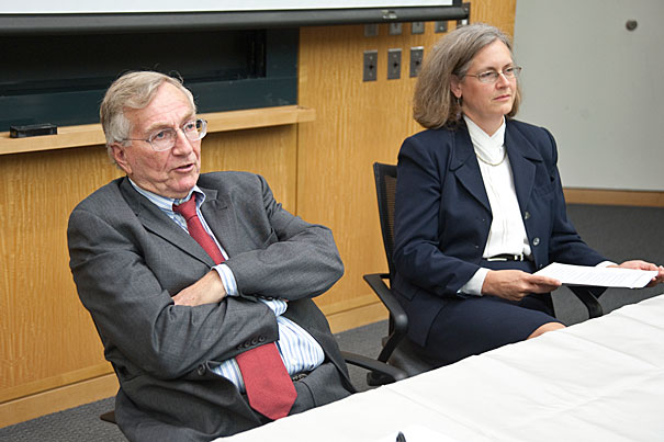 Seymour Hersh (left), who delivered the annual Manshel Lecture, offered a “gloomy” picture of the Afghan war that has few prospects for the United States exiting cleanly or soon. Hersh was introduced by Weatherhead Center director Beth Simmons (right).