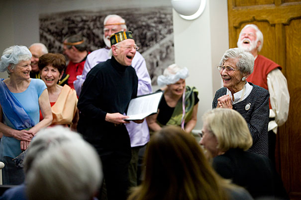 It’s a full life for retirees at Harvard. In addition to the Harvard University Retirees Association, there’s the Harvard Institute for Learning in Retirement. Last year they performed a medley of Shakespearean scenes to celebrate the 100th birthday of member Frances Addelson (far right).