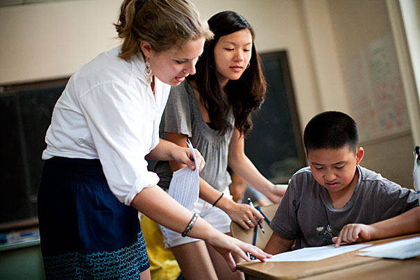 Abigail Bok (from left) and junior counselor Cindy Guan lead a class activity for campers. “I didn’t feel like I knew anyone here,” said Guan, 17, a senior at Boston Latin School who grew up in Chinatown and volunteers in the PBHA program there. “Doing the after-school program made me feel like I was a part of my community; it made me feel like I was giving back.”