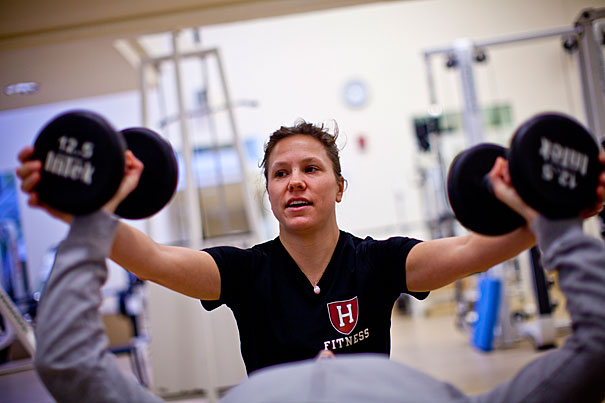 That’s right. Because Kunkel, along with about 200 of her colleagues from around the University, participated in Maintain Don’t Gain this year. Co-sponsored by the Harvard Recreation Department and the Center for Wellness, the program pits teams of four to six people against each other for prizes such as personal training sessions, private classes for the team, a massage, a team lunch — “and bragging rights,” says Kerry L. Smith, programs manager and a personal trainer at Hemenway Gymnasium. “It’s very big at Harvard to say that you won.”