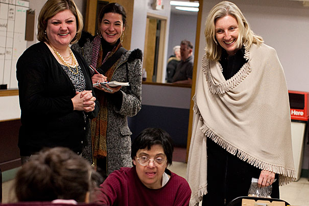On a visit to the Vocational Advancement Center (VAC), Christine Heenan (right), Harvard’s vice president of public affairs and communications, and Amy Bell (left), executive director of VAC, talk with participants in a cooking group. The VAC, which was awarded a $25,000 grant from the Harvard Allston Partnership Fund, is one of eight local nonprofit organizations to receive checks last week totaling $100,000.