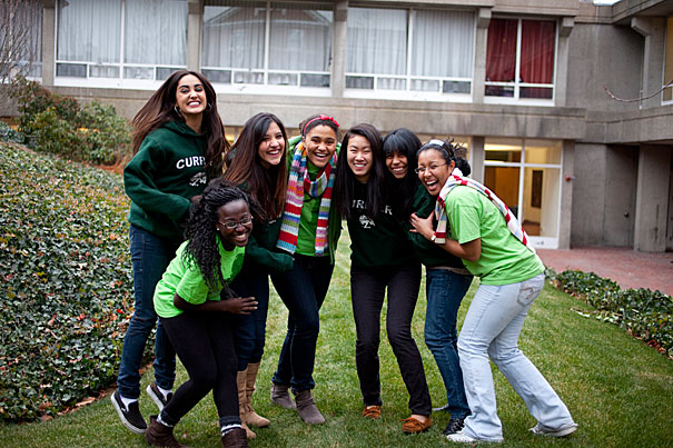 Currier House housemates Rachel Bervell (from left), Nadia Farjood, Jeanette Schnierle, Jordan Ashwood, Sarah Mumanachit, Karina Herrera, and Melissa Naidoo cheer on their House, the only housing facility named in honor of a woman.