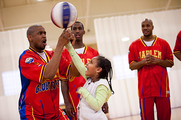 Dressed in their signature red and blue uniforms, the Globetrotters told the crowd their names and where they graduated from college. Then they broke out the heavy stuff: “Cooperation,” cheered a Globetrotter. “Cooperation,” responded the crowd. Together, the big players and little kids rattled through the CHEER list and discussed each concept, and the players threw in a few lessons on basketball tricks on the side.