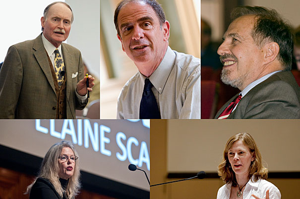 “Harvard is an institution of truly great teachers,” said Faculty of Arts and Sciences Dean Michael D. Smith. “Each year, it is a pleasure to recognize great scholars like Benedict Gross, Farish Jenkins, Arthur Kleinman, Elaine Scarry, and Alison Simmons for their pedagogical excellence. As Harvard College Professors, they are made visible to their colleagues as rich sources of insight and experience.” Jenkins (clockwise from top left), Gross, Kleinman, Simmons, and Scarry said they were honored by the award.