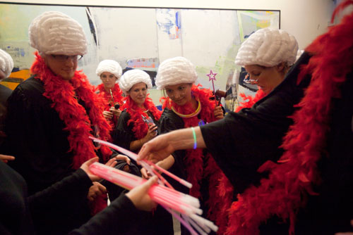 Students donned black robes, white wigs, red feather boas, and glow-in-the-dark necklaces, and carried star-shaped wands or small plastic gavels for their parade into Harvard Yard.