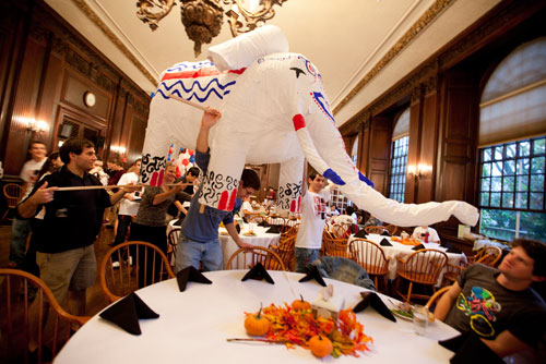 Graham Frankel ’12 said that building the 500-pound float had kept the team up until 7 a.m. “It’s taken about 120 man-hours to construct,” Frankel said. Matthew Chuchul ’13 eagerly pointed out the lights that the team had run across the structure, including black lights beneath the snowy white fabric.