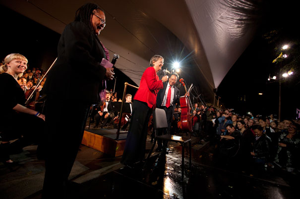 The final moments of the official ceremony, around 9:15 p.m., brought a birthday surprise, in the form of the Jimmy Vali band, live and kicking. So began the end-of-night boogieing, in a kind of outdoor, raincoat-wearing disco.