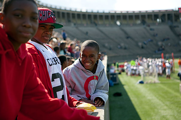 Taking part in Harvard’s annual Community Football Day were (from left) Jamal Peters, 13, Kyree Johnson, 12, and Saheim Jackson, 8. The Cambridge youngsters were among the 1,000 or so community residents invited to the Crimson football game on Oct. 15.