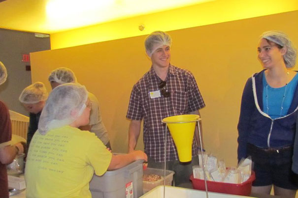 “We were thrilled with the response to the 9/11 event,” she said. “Ticknor Lounge was absolutely packed from the very beginning to the very end of the event. We kept rotating people in and out of the assembly lines to give everybody a chance to package the food. We had people writing letters to members of Congress in support of hunger relief programs, and we still couldn’t find a job for everyone who wanted to participate. We don’t think we’ll have that problem again this month, given that we’ve more than doubled our goal to 20,000 meals.”