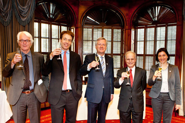 “The Harvard College program to be launched in Freiburg is the first faculty-led semester-long study-abroad program in Harvard history,” said Jorge Dominguez, vice provost for international affairs, who was present at the Oct. 31 ceremony. Other guests included University of Freiburg Professor Franz-Josef Brüggemeier (from left), Harvard Professor Sven Beckert, University of Freiburg Professor Hans-Jochen Schiewer, Dominguez, and Katharina Aly, director of the International Office in Freiburg.