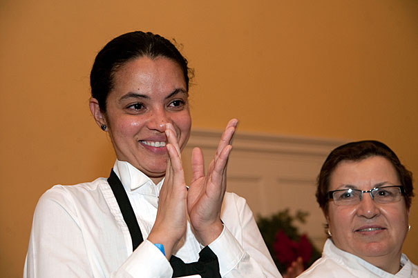 Kitchen staff Liliana Lopes (left) smiles through her tears as she and Filomena Costa react to applause after receiving gifts and acknowledgement for their contributions to the quality of life at Lowell House.