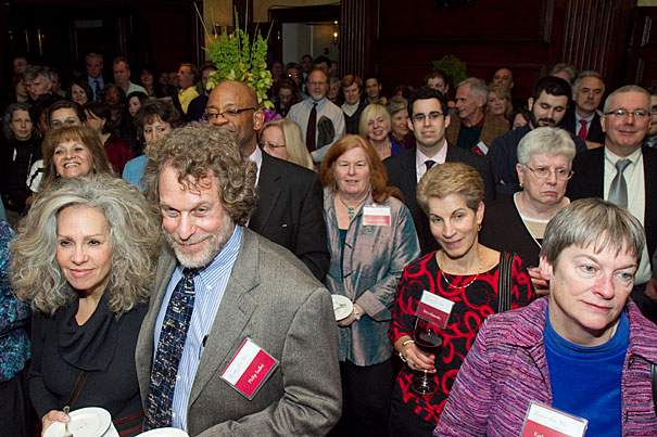Honorees listen to President Drew Faust’s talk, including Philip Sadler (left), Frances W. Wright Senior Lecturer on Celestial Navigation, and Katherine Kraft (far right), senior archivist at the Schlesinger Library.