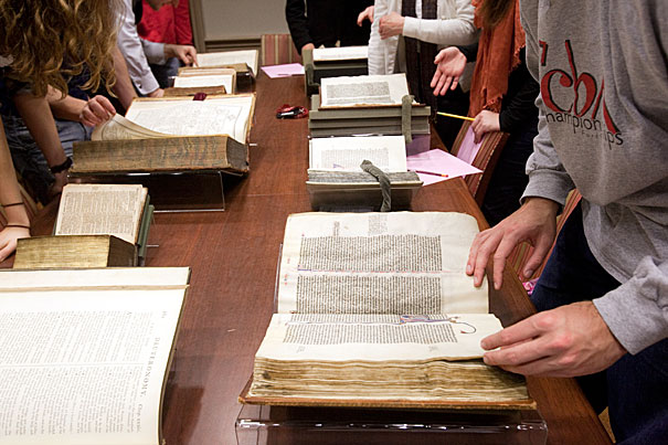 Students pore over old texts in the Gen Ed class “Introduction to the Bible.”
