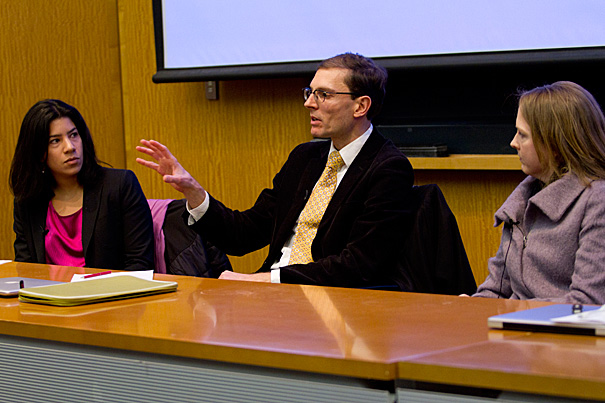 Maya Jasanoff and her faculty colleagues gathered at the Tsai Auditorium on Feb. 16 and March 7 to consider how the Faculty of Arts and Sciences (FAS) may look in a generation. The February session included, among others, Jasanoff (from left), Harvard faculty Martin Puchner, and Ann Pearson.