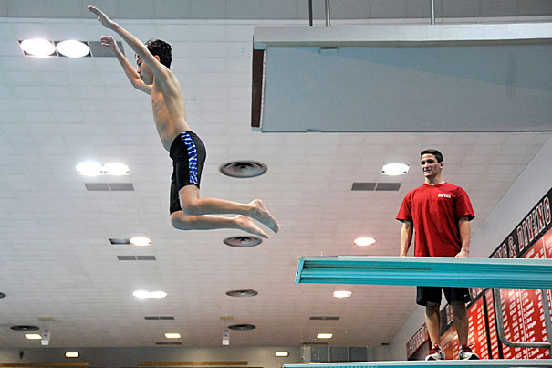 Diver and Olympic qualifier Mike Mosca ’15 oversees burgeoning diver Thomas Choy, 15.