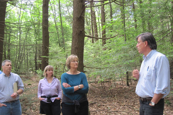 Harvard President Drew Faust (center) listens as Harvard Forest Director David Foster (right) explains the plight of this stand of 200+-year-old Eastern Hemlock trees, now infested with the hemlock woolly adelgid, an invasive pest.