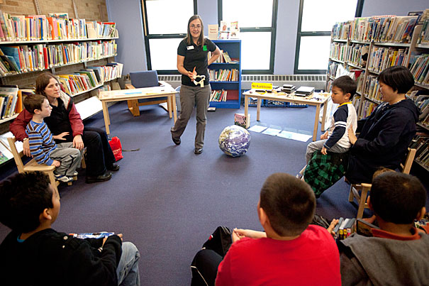 Gunzelmann presented a treasure trove of HMNH resources to parents and kids, challenging the standing-room-only crowd to think about the different classifications of zoology, as part of the John Harvard Book Celebration program. Celebrating Harvard’s 375th anniversary and its close ties to the Boston and Cambridge communities, the John Harvard Book Celebration has included the donation of more than 400 books to libraries, 17 lectures by Harvard faculty and members of the University’s Board of Overseers at local libraries, and 18 programs for children and youth. This particular youth-based programming reached more than 200 children in the Greater Boston area this spring, concluding with this last event in late April.