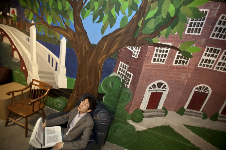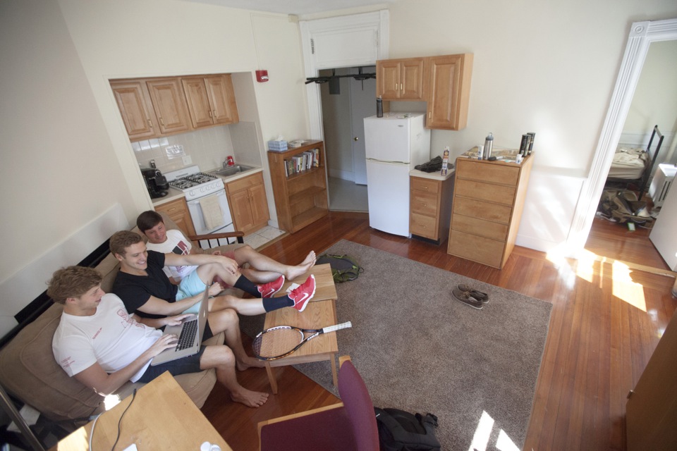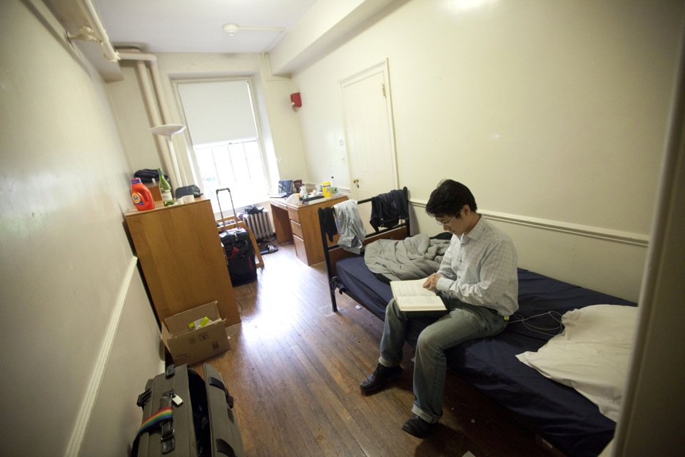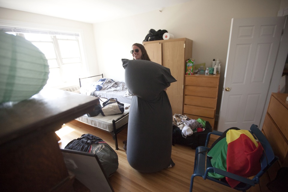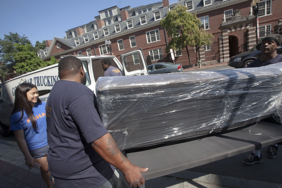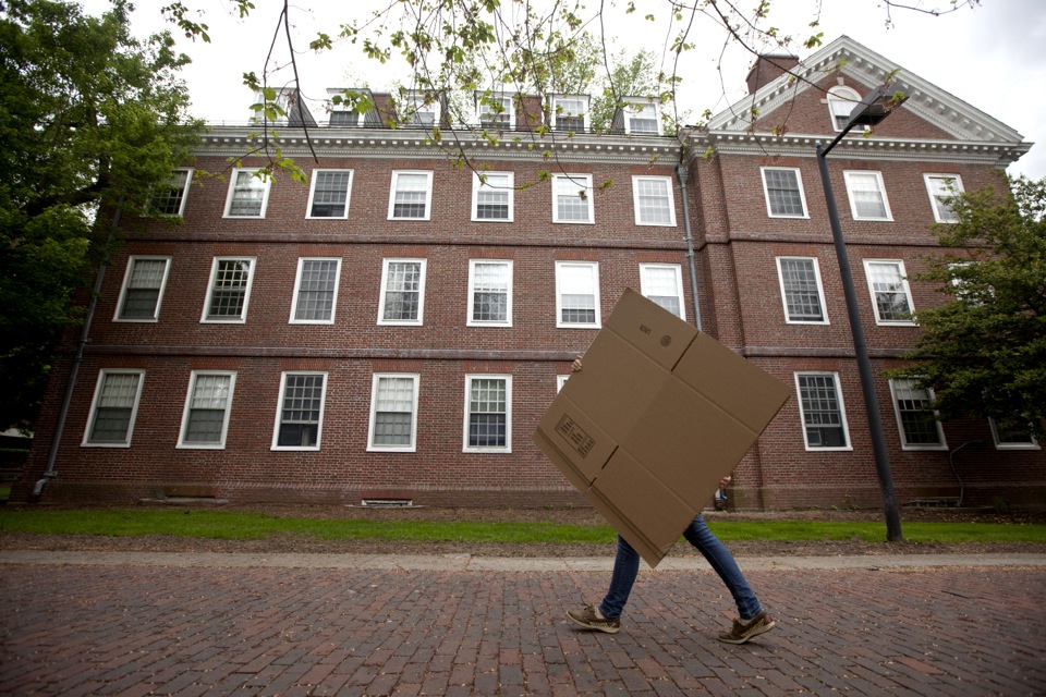 Emma Lipshultz `15 (left) moves into swing housing inside Ridgley Hall on Massachusetts Ave. with the help of her brother, Zack, and her mother, Tracy Miller. Immediately after Harvard’s Commencement, fencing for the Old Quincy House renovation was installed. School time and the living is easy! Emma Lipshultz `15 outfits her room in Ridgley Hall with a beanbag couch. Inside Hampden Hall, Wendy Chen `14 (left) sorts through clothes with friend Michelle Timmerman `13, who lives next door in Adams House. Movers assist Edith Chan `12-`13 in moving into her new home: Fairfax Hall. Matt Tufano `13 (from left), Scott Yim `13, and Christine Hughes `13 set up sound equipment for a Quincy House welcome-back barbecue. The façade of Fairfax Hall swing housing is bedecked with balloons. Luchen Wang `14 lounges in front of a student mural depicting Quincy House and the Weeks Bridge in the basement of Old Quincy prior to renovations. Framed by the doorway to his bathroom, Luchen Wang `14 studies in his Old Quincy House dorm before the renovation. Wang’s roommate had to pass through Wang’s room to get to the bathroom and Wang needed to pass through his roommate’s room to leave the dorm. The new configuration is more spacious and provides more privacy. Kyle McIntee `15, (from left), Chuck Katis `15, and Matt Karle `15, who are now living in adjacent rooms in Fairfax Hall swing housing, reunite after the summer. Total eclipse: A student moves from Old Quincy House into swing housing.