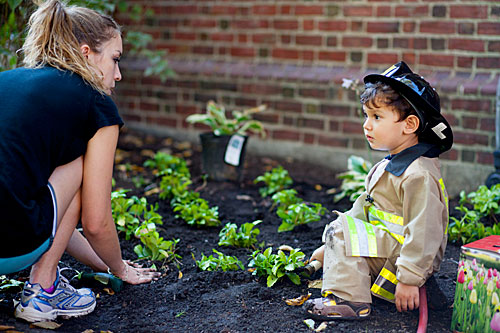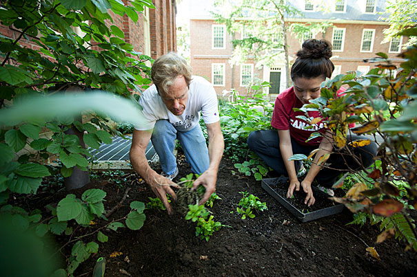 “We had areas of the Yard that we just felt could look a little better, and we wanted students to have a chance to feel involved with their environment,” said Dean of Freshmen Tom Dingman (left). Dingman was joined by Rosalie Nathans ’16 in the beautification efforts.