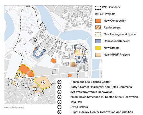 A second major development project, the residential and retail commons proposed for Barry’s Corner, is also being permitted separately from projects included in the IMPNF. The University has partnered with Samuels & Associates, a well-known Boston real estate developer, to bring the noninstitutional, mixed-use project to fruition.