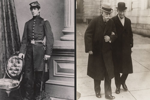 To aid searches, the suite is divided into six phases of Holmes’ life: youth, Civil War service, early career, judicial career, personal life, and later life. A visitor can move from the fresh-faced boy posing with his siblings, to the erect soldier of 22, to the jurist in his prime at work behind a desk, to the elderly Holmes, stooped as he walks beside Supreme Court colleague Louis Brandeis.