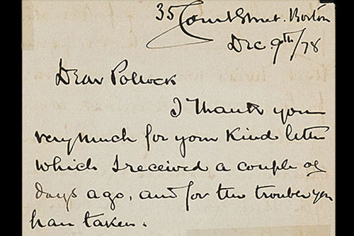 The suite’s five manuscript collections indicate the depth and chronological range of the holdings. These include the John G. Palfrey (1875-1945) Collection of Oliver Wendell Holmes Jr. Papers, 1715-1938; the Mark DeWolfe Howe Research Materials Related to the Life of Oliver Wendell Holmes Jr., 1858-1968; the Edward J. Holmes Collection of Oliver Wendell Holmes Jr. Materials, 1853-1944; the Oliver Wendell Holmes Jr. Addenda, 1818-1978; and the Letters from Holmes to Lady Castletown Small Manuscript Collection. (Holmes, during a long relationship with Lady Clare Castletown of Ireland, called her “my Hibernian.”)