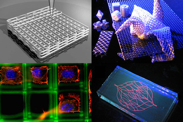 Jennifer A. Lewis’ understanding of the chemistry and physics of soft materials enables her to design and manipulate various soft materials to create architectures that mimic those found in nature. A schematic view of the printing process for 3-D hydrogel scaffolds (clockwise from top left); origami made by printing and folding intricate 3-D metallic and ceramic structures; a hydrogel with an embedded microvascular network, for use in tissue engineering; and a hydrogel scaffold seeded with fibroblast cells.