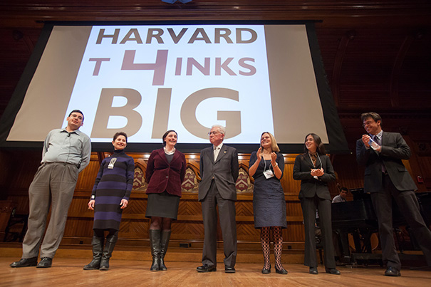 Six professors and one student presented seven big ideas in the annual Harvard Thinks Big. This year’s participants included Joseph Blitzstein (left to right), Doris Sommer, Katie Hinde, Roberto Mangabeira Unger, Emma Dench, Annie Ryu ’13, and Michael Puett.