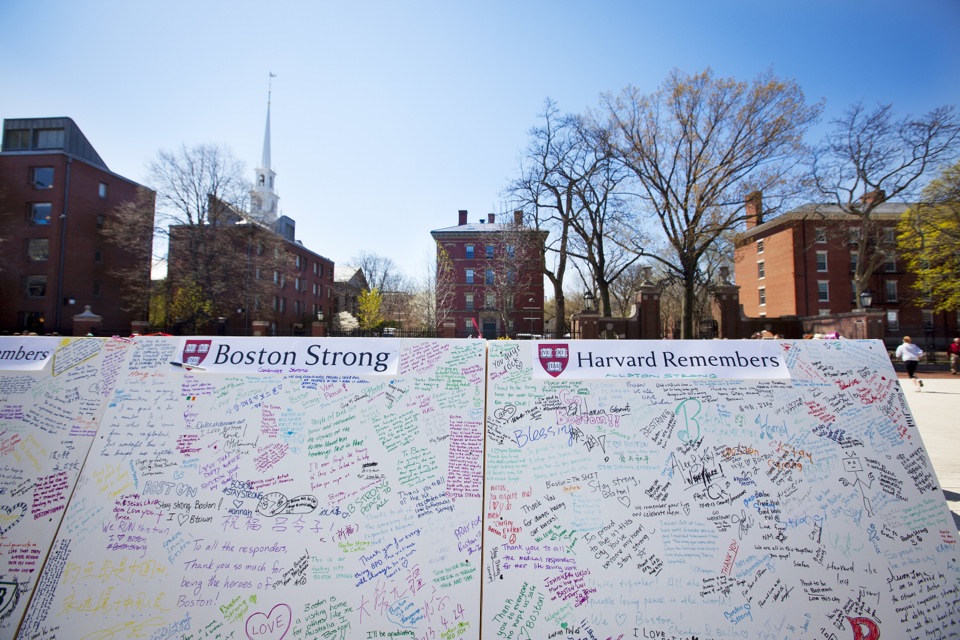In the wake of tragedy, people gather to support each other, and to give thanks for family, friends, and community. After the Boston Marathon bombings and the area shutdown during the search for the suspects, the Harvard community has been doing just that.