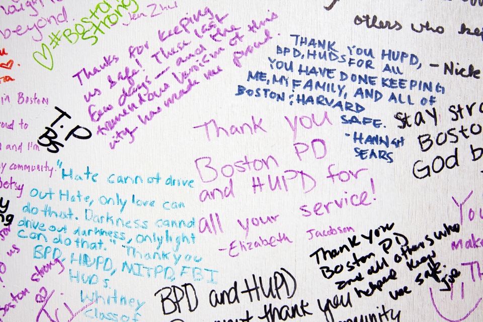 “The remembrance walls are a beautiful testament to the power of community,” said Tara Raghuveer, the UC president who, along with vice president Jennifer Q. Zhu, brought the council’s idea to the president’s office. “The students were interested in thanking the staff in the Houses and police at Harvard and in Boston and Cambridge for all their help. It was a tragic series of events, but the silver lining is we were able to come together and be reminded that so many people are dedicated to our safety and security.”