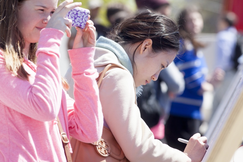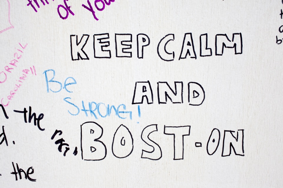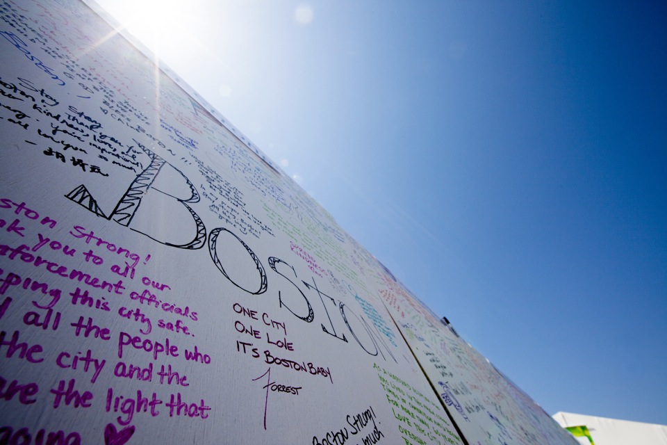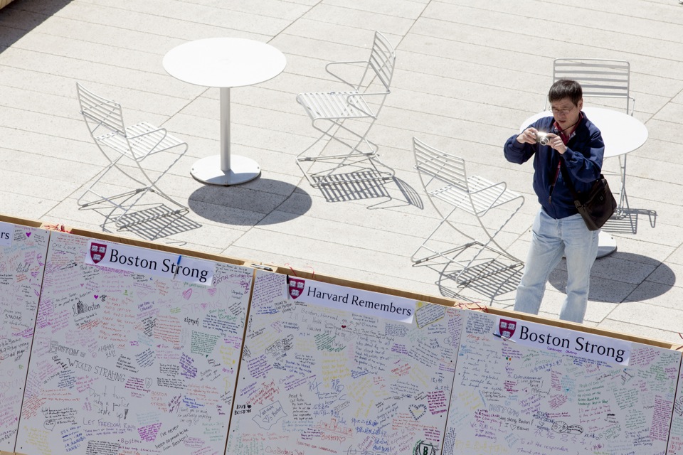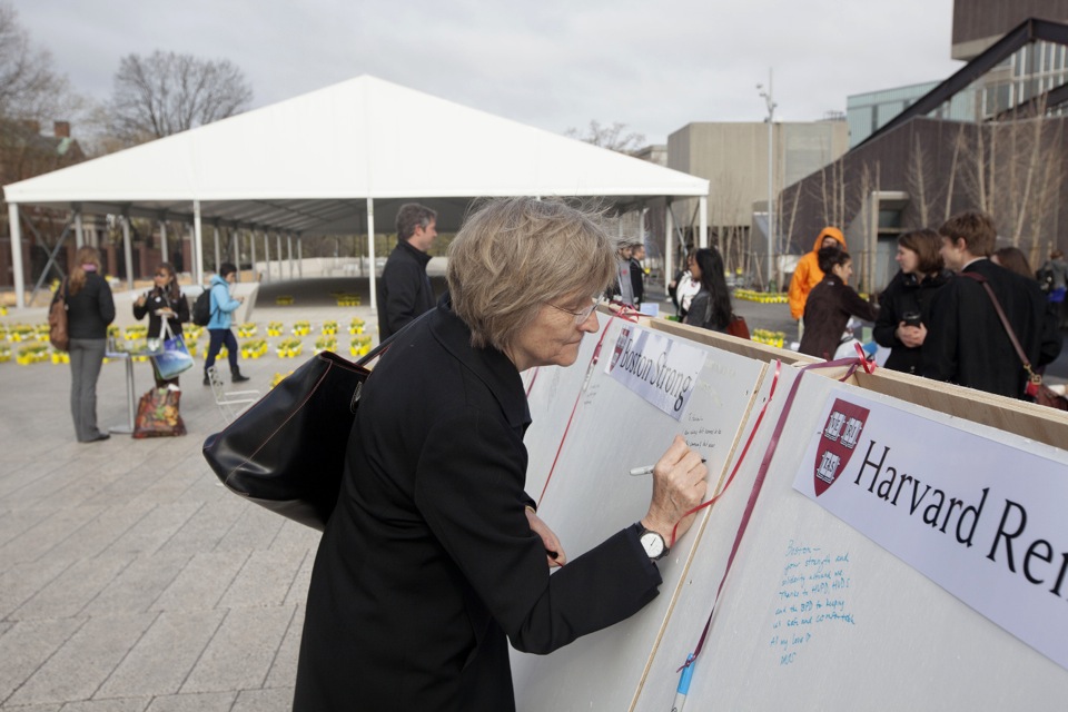 At daybreak on April 24, the day of a memorial service for slain Massachusetts Institute of Technology police officer Sean Collier, 20 stark whiteboards with the words “Boston Strong” and “Harvard Remembers” bannered across their tops appeared in the newly renovated plaza near the Science Center. A stream of yellow, potted daffodils lined the area, where passersby were invited to take up dangling pens and share their thoughts or feelings.