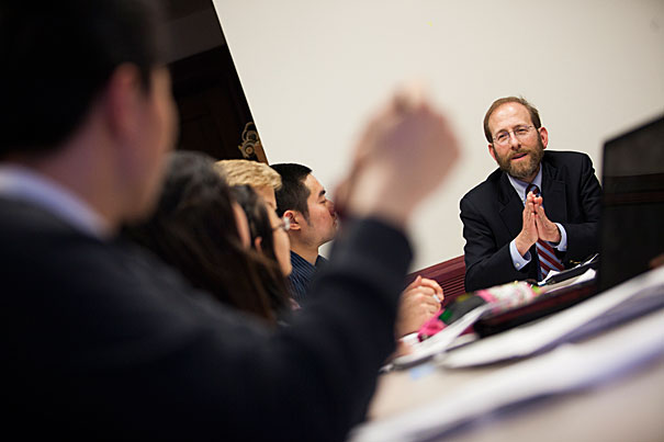 As provost, Alan Garber’s job is to help all of Harvard’s Schools work as one, a role that requires a near-constant aerial view of the University. But for two hours each week, he gets to narrow his focus to just 12 students, laptop-wielding freshmen who on a recent rainy afternoon gathered around a conference table in Sever Hall in his class called “Health Care on Less than $8,000 a Year.”