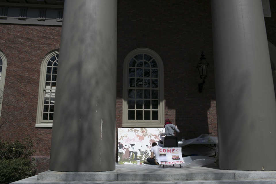 Gilon, an artist specializing in community projects, brainstormed with Harvard students about what cultural and religious diversity looked like and meant to them. The group decided on an image of the Holi festival, a Hindu spring fete of colors.