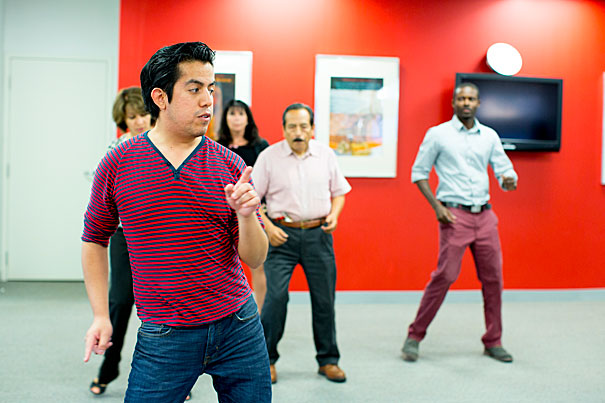 Professional ballroom dancer Marco Perez-Moreno ’13 teaches a salsa move to Minoo Ghoreishi (from left), Gail Olivier, Pedro Romero, and Asare Christian (photo 1); David and Angela Franks practice what they’ve learned (photo 2); and Asare Christian can’t help but smile (photo 3).