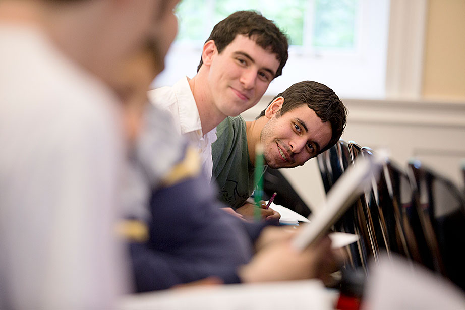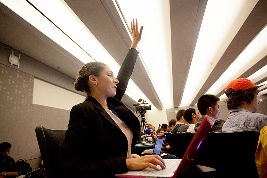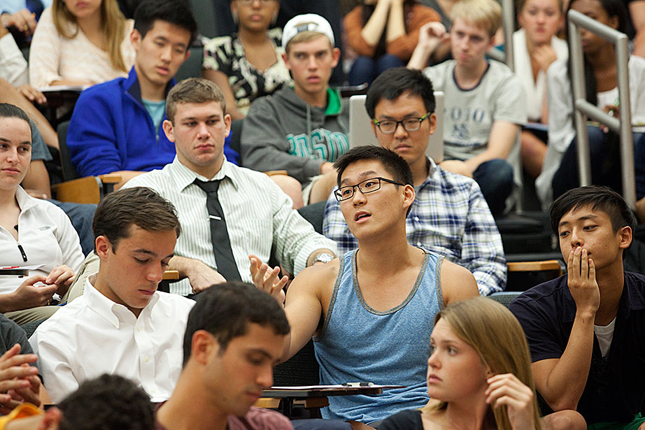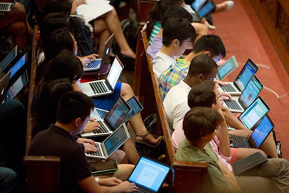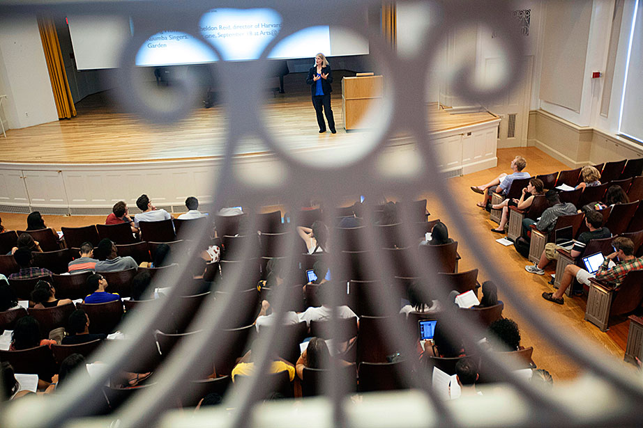 Ingrid Monson, Quincy Jones Professor of African American Music, lectures in Paine Hall during African and African American Studies 97a: “R&B, Soul, Funk.” Kris Snibbe/Harvard Staff Photographer Students work on laptops in Eric Mazur’s Applied Physics 50a: “Physics as a Foundation for Science and Engineering.” Jon Chase/Harvard Staff Photographer Balkanski Professor of Physics and Applied Physics Eric Mazur teaches 50a: “Physics as a Foundation for Science and Engineering” in Pierce Hall. Jon Chase/Harvard Staff Photographer William Henry Bloomberg Professor of Economics Raj Chetty uses projected diagrams in his “Public Economics and Fiscal Policy I” class, held in the Littauer Building. Stephanie Mitchell/Harvard Staff Photographer Cassandra Peitzman (left) and Gabriel Tourek listen to Raj Chetty’s lecture. Stephanie Mitchell/Harvard Staff Photographer Charles Warren Professor of American History Vincent Brown teaches “African Diaspora in the Americas” in Sever Hall. Stephanie Mitchell/Harvard Staff Photographer Cary Williams ’16 pays close attention to Vincent Brown’s lecture during class. Stephanie Mitchell/Harvard Staff Photographer Professor of the Classics and of History Emma Dench teaches in Harvard Hall. Rose Lincoln/Harvard Staff Photographer Elliot Wilson ’15 (left) and Stefan Poltorzycki ’15 socialize with other students before the start of Emma Dench’s class. Rose Lincoln/Harvard Staff Photographer Students gather in Sanders Theatre for Professor Michael Puett’s lecture on Chinese history. Rose Lincoln/Harvard Staff Photographer Michael Puett, Walter C. Klein Professor of Chinese History and chair of the Committee on the Study of Religion, lectures on the Sanders Theatre stage. Rose Lincoln/Harvard Staff Photographer Students take notes on laptops during Michael Puett’s talk. Rose Lincoln/Harvard Staff Photographer Adaliss Rodriguez M.T.S. ’15 raises her hand to ask a question in Esther and Sidney Rabb Professor Arthur Kleinman’s General Education class “Case Studies in Global Health” in the Northwest Science Building. Kris Snibbe/Harvard Staff Photographer Kolokotrones University Professor of Global Health and Social Medicine Paul Farmer (left), Associate Professor of Global Health and Social Medicine Salmaan Keshavjee, and Arthur Kleinman speak together during “Case Studies in Global Health.” Kris Snibbe/Harvard Staff Photographer Harvard Hall hosts 300th Anniversary University Professor Laurel Ulrich’s class “Tangible Things.” Stephanie Mitchell/Harvard Staff Photographer Students ask questions during “Ethics, Biotech, and the Future of Human Nature,” a joint class of Thomas Dudley Cabot Professor in the Natural Sciences Doug Melton and Anne T. and Robert M. Bass Professor of Government Michael Sandel. Jon Chase/Harvard Staff Photographer Xander University Professor Doug Melton teaches “Ethics, Biotech, and the Future of Human Nature” in Tsai Auditorium at CGIS South. Jon Chase/Harvard Staff Photographer Anne T. and Robert M. Bass Professor of Government Michael Sandel talks with students following class. Jon Chase/Harvard Staff Photographer