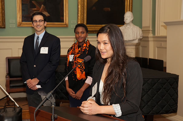 Weissman alum Li Murphy ’15 spoke as fellow alums Mateus Falci ’14 (left) and Naimonu James ’14 listened (photo 1). Falci presented Harriet Weissman with a gift (photo 2). Diana Sorensen (from left), dean of arts and humanities, joined Weissman alum Michele Wu and Paul Weissman at the University Hall reception honoring the Weissmans.