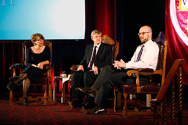 Three Harvard scholars — Jill Lepore (from left, photo 1), David Hempton, and Michael Norton — offered their thoughts on what it means to lead a good life in today’s complex world. President Drew Faust opened the HAA-sponsored talk in London (photo 2), which included an opportunity for people to share what Harvard means to them. For Hempton (photo 3), it is “Where I try to make the world a better place.”