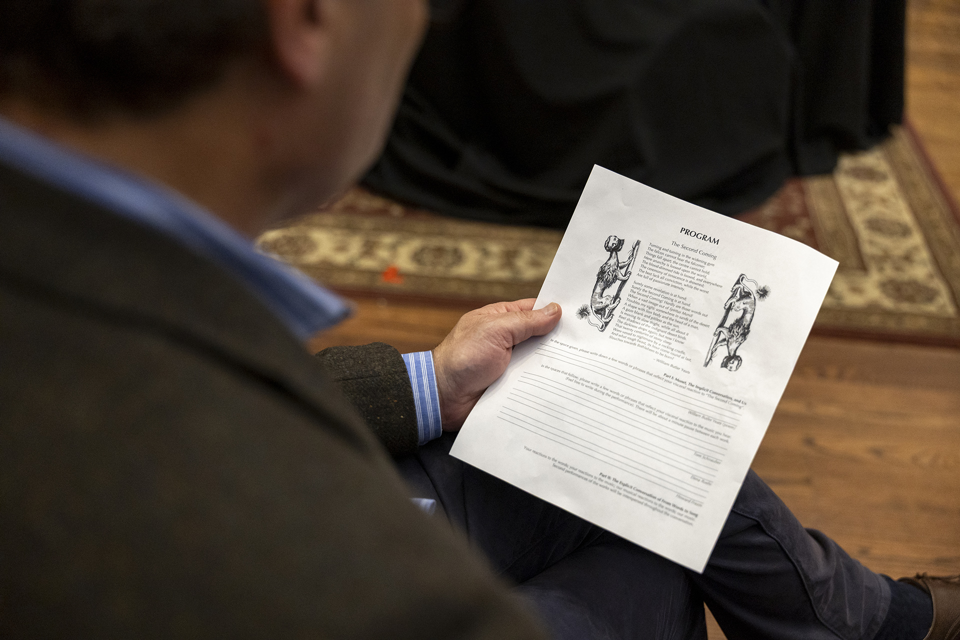 With that in mind, the program began with a reading of Yeats’ poem. Its imagery of disconnection and a strange Sphynx-like creature waking as a moment of doom approaches, was written in 1919. That tumultuous time, following the horrific destruction of the first World War as well as Ireland’s struggles for independence, echoes into our own era, as audience members quickly noted.