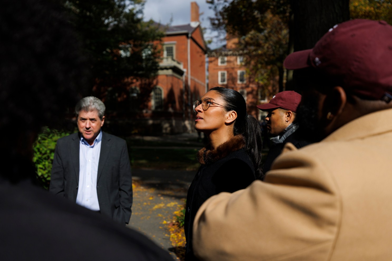 Faust and Marc Goodheart, vice president and senior adviser to the president and provost, led the cast members on a tour of some of the historic sites in Harvard Yard, including Massachusetts Hall, which once housed founding fathers Samuel Adams, John Adams, John Hancock, and Elbridge Gerry as students, as well as Hollis Hall and Holden Chapel, which (like Mass Hall) housed Continental Army soldiers during the Revolutionary War.