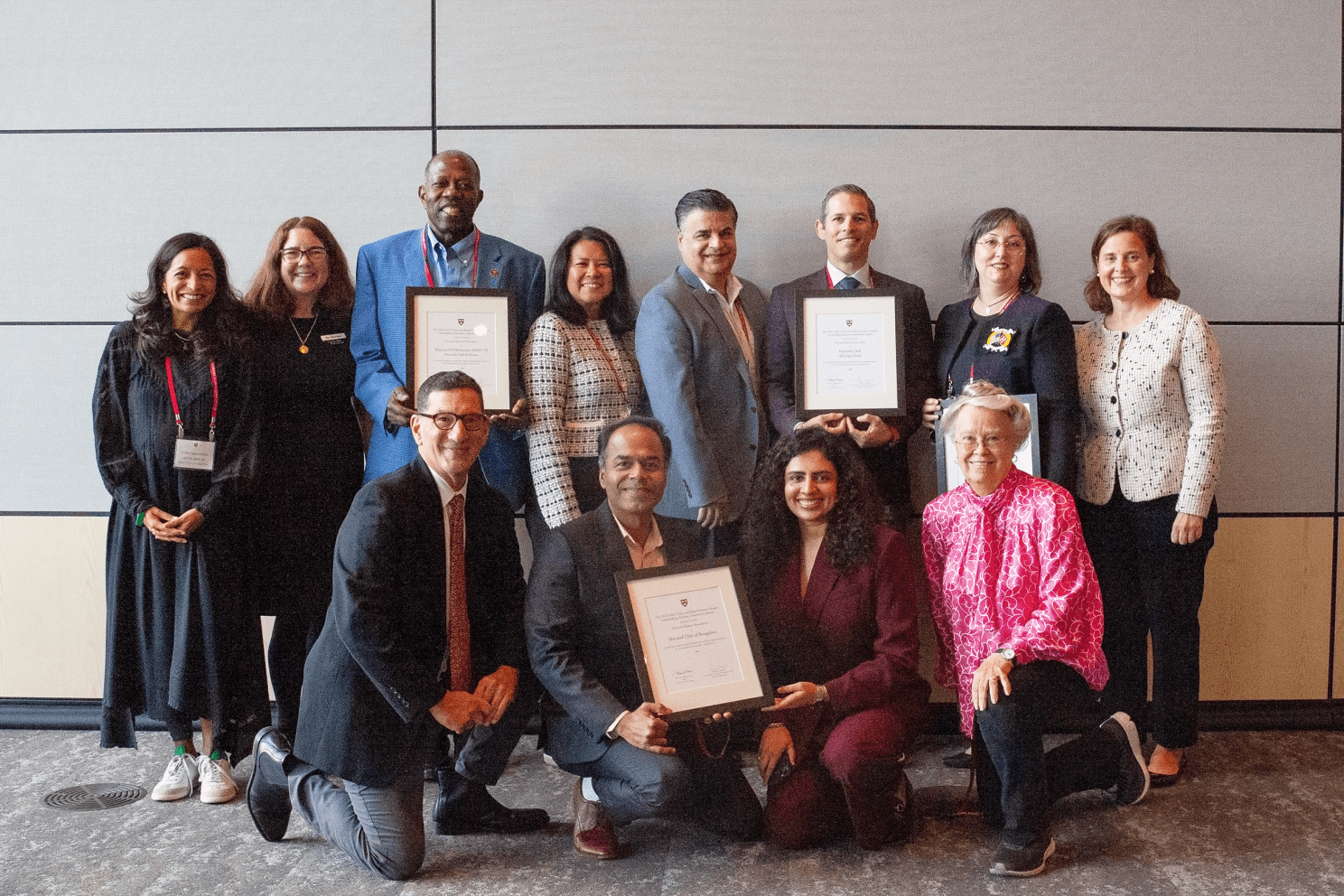 Back row L to R: Tara Abrahams ’99, M.B.A ’04, vice president for Clubs and Shared Interest Groups; Mary-Helen Black, Clubs & SIGs director; Marcus DeFlorimonte, P.M.D. ’95, appointed director, Harvard Club of Boston; Nanette Bischoff ’91, PC ’91, treasurer, Harvard Club of Long Island; Skip Stern ’81, immediate past president, Harvard Club of Long Island; Joel Friedman ’98, president Harvard Club of Long Island; Lydia Rossman, A.L.M. ’24, vice president of Harvard Veterans Alumni Organization; Sarah C. Karmon, associate vice president and executive director of the HAA. Front row L to R: Will Makris, Ed.M. ’00, HAA alumni president; Sooraj Mundayat, SELP ’19, president Harvard Club of Bengaluru; Shilpa Gangadharan Manari, P.L.D.A. ’19, vice president, Harvard Club of Bengaluru; Judy Esterquest ’72, A.M. ’77, Ph.D. ’80, officer, Harvard Club of Long Island.