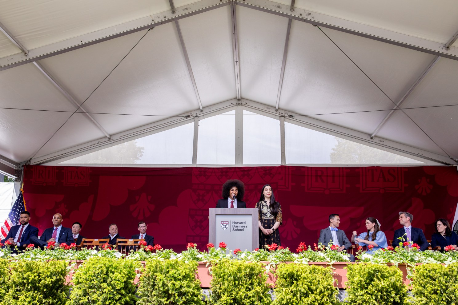 All 929 members of the Harvard Business School (HBS) MBA Class of 2025 gathered at Baker Lawn under clear skies to celebrate Class Day on Wednesday. Taking place the day before Commencement, Class Day is an annual event organized by graduating students to celebrate the achievements, contributions and community of the graduating MBA class. Along with family, friends, and guests, graduates honored faculty teaching award recipients and listened to speeches from classmates and one of this year’s Alumni Achievement Award winners.